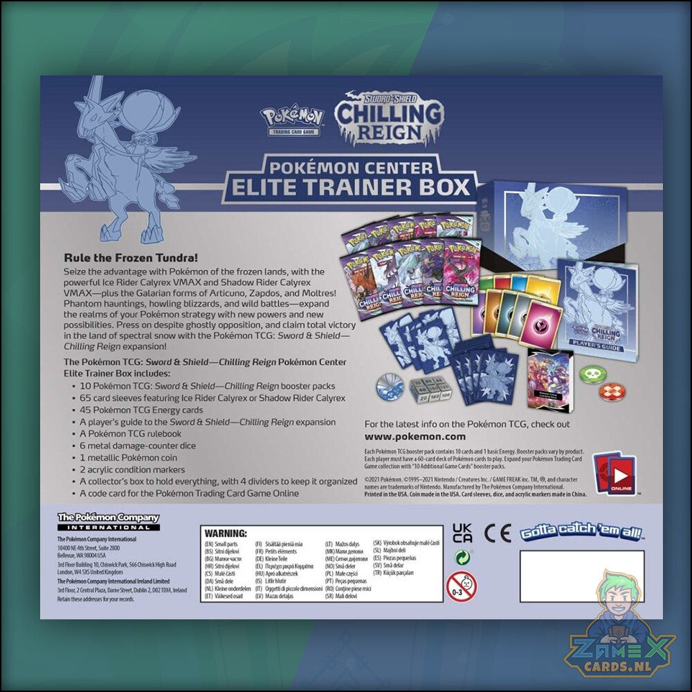 Grijp je voordeel met de Pokémon van de bevroren landen met Pokémon Sword & Shield Chilling Reign! De Chilling Reign uitbreiding bevat naast de coole Pokémon Ice Rider Calyrex VMAX en Shadow Rider Calyrex VMAX, ook de Galarian forms van Articuno, Zapdos en Moltres! Fantoom achtervolgingen, krijsende sneeuwstormen en wilde battles - breid je strategie uit met alle nieuwe krachten en mogelijkheden die Pokémon Sword & Shield Chilling Reign bevat!