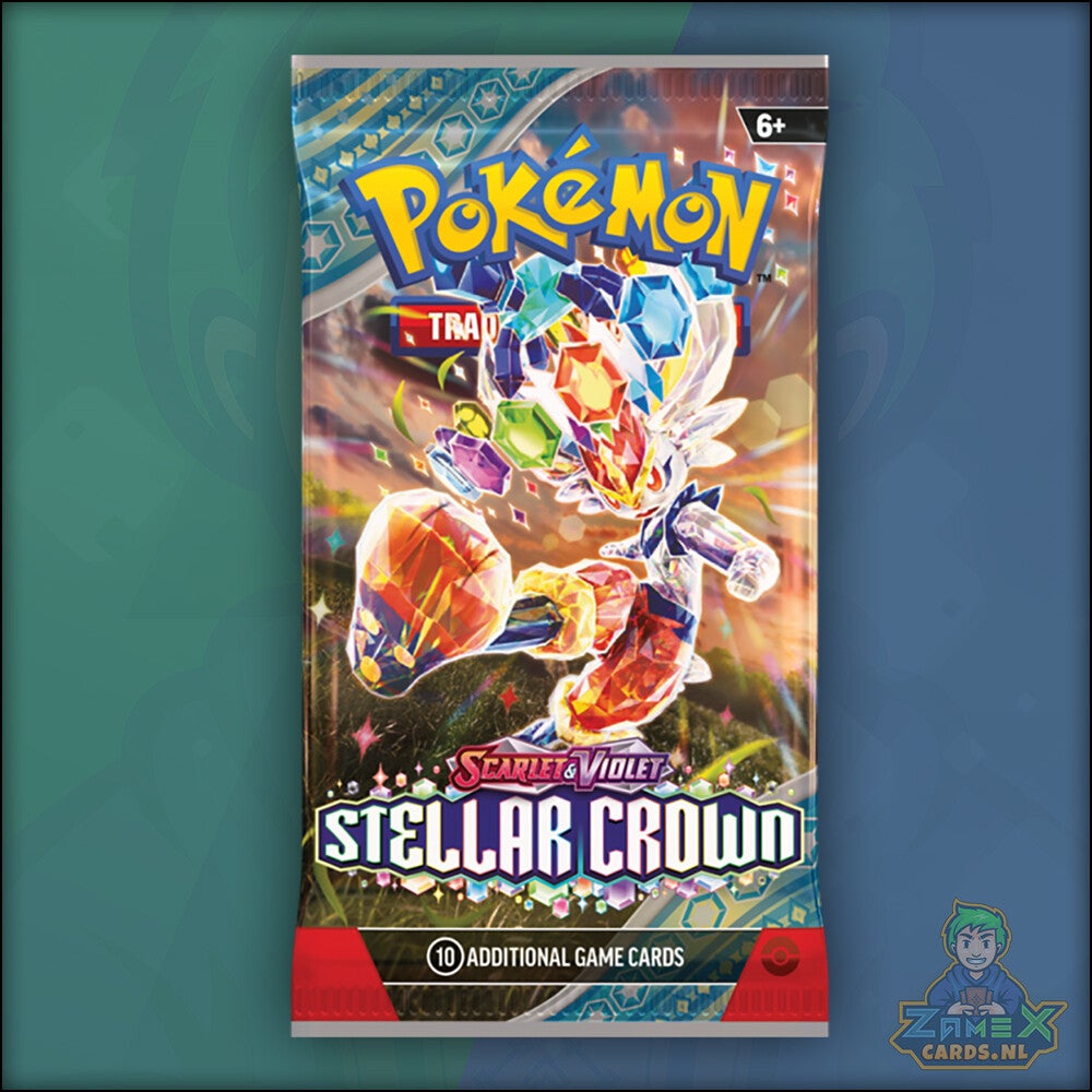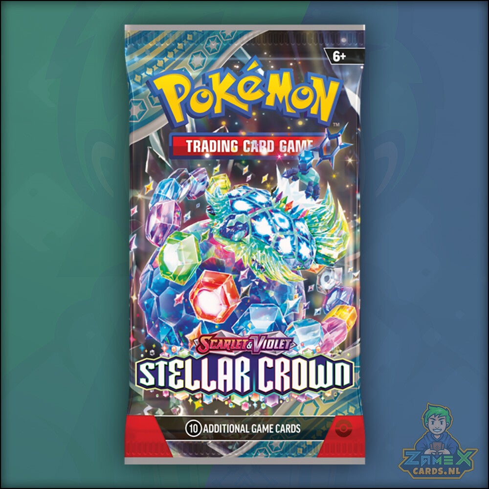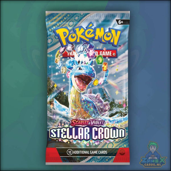 Daal af naar een wereld onder de oppervlakte en ontdek de ware mogelijkheden van het Terastal-fenomeen! De Legendarische Pokémon Terapagos bestijgt de troon en wordt vergezeld door Cinderace ex, Lapras ex en Galvantula ex, die allemaal briljante nieuwe krachten bezitten als Stellar Tera Pokémon ex. De pas ontdekte Hydrapple ex leidt nog meer Pokémon ex de strijd in, en ACE SPEC-kaarten blijven het spel opschudden in de uitbreiding Pokémon TCG: Scarlet & Violet-Stellar Crown.